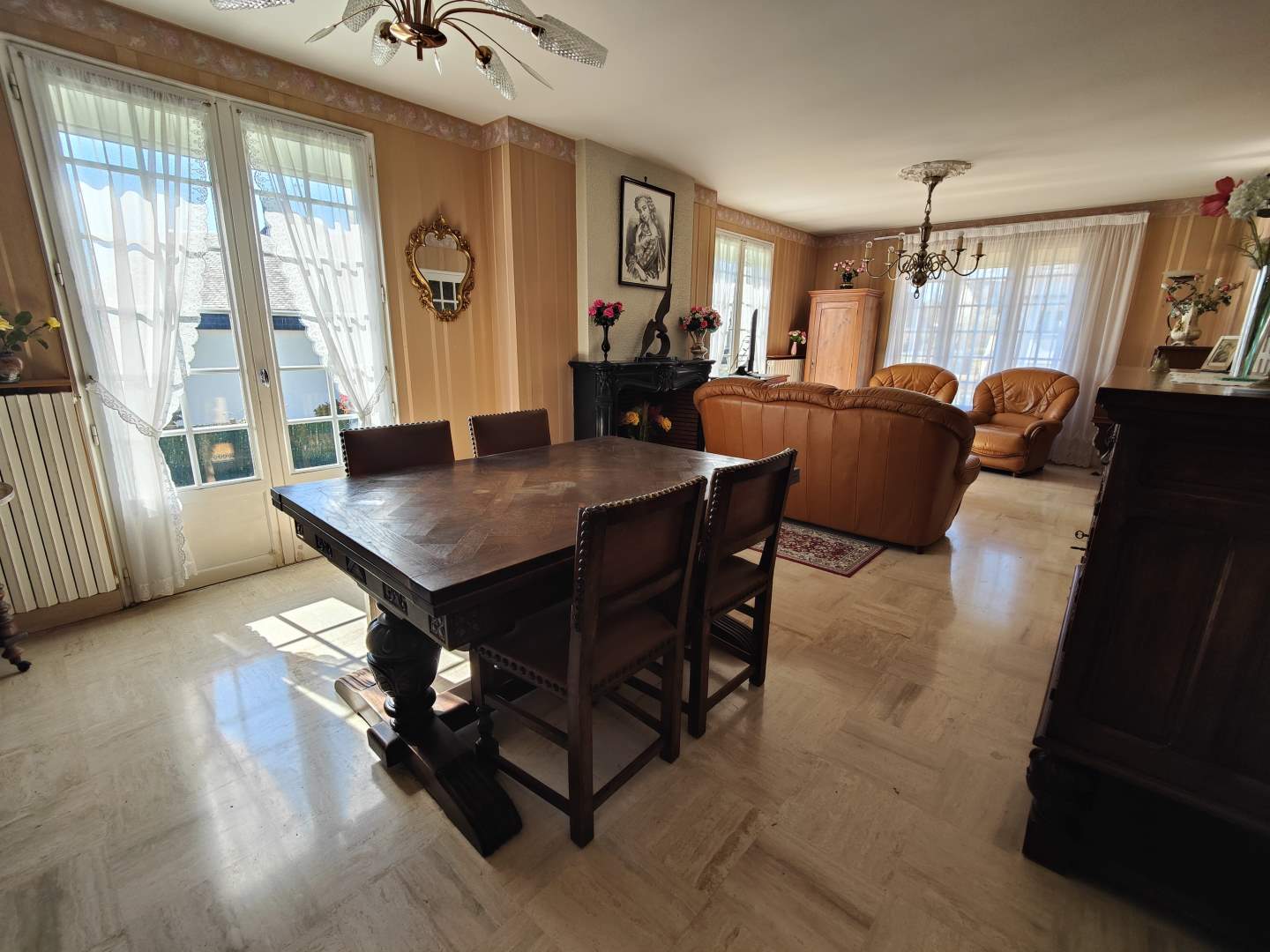 D'une entrée avec une belle hauteur sous plafond, un lumineux salon exposé sud-ouest avec une cheminée de 31m² et d'une cuisine de 12m² aménagée et équipée,